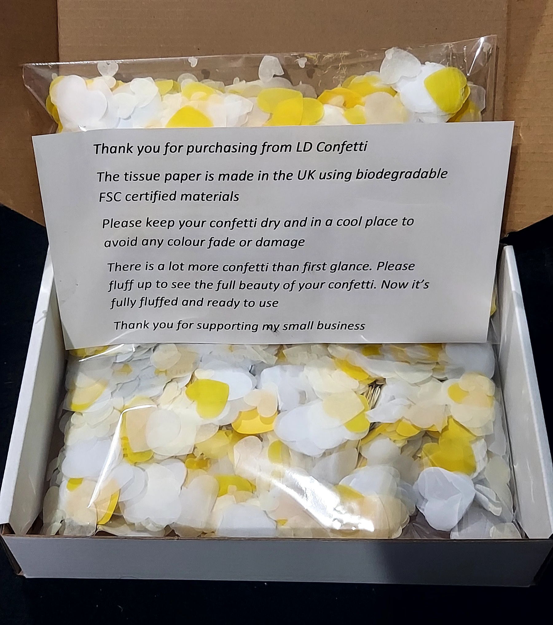 Great communication from Lisa, it took less than 30 minutes to complete an order. Very affordable and had the option of first class postage to ensure it is here for the big day. Lisa said she would keep me updated throughout the order process. Super impressed. I will leave another review once my confetti has arrived! Thanks so much LD Confetti, I’m looking forwards to my delivery!